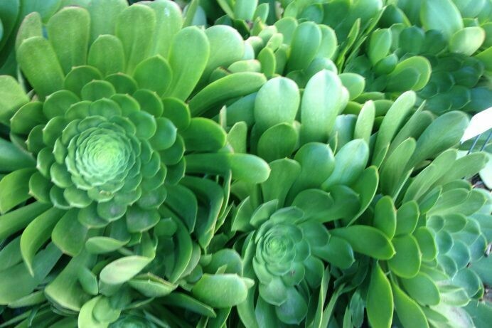 Aeonium urbicum ‘Salad Bowl’ has huge green rosettes up to 18 inches across look like giant salad bowls. Full coastal sun to partial shade, or shade inland. Great for very “tropical” appearance. Grows in clusters to 3 or 4 feet wide. Rests during hot summer months, so reduce watering. Tender to frost. Blooms cream flowers on spikes in winter and early spring.
