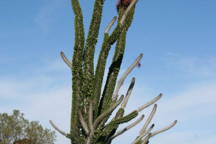 Alluaudia procera, commonly known as African (Madigascan) is an African Ocotillo that can grow 2-3 feet per year, even along the coast, developing into magnificent specimens of erect branches reaching for the sky. The amount of water this plant gets determines its rate of growth! Striking vertical accent growing up to 18′-20′ tall by 4′-6′ wide in the landscape. It can be very water-wise, but a lack of water will slow its growth. It’s seasonally deciduous leaves are small, green and succulent. The sculptured stems are thorny and have a beautiful, silver, metallic cast to them. Our native Ocotillos have red flowers, while the African Ocotillo has white. Full sun, tender to frost, hardy to mid 20’s.