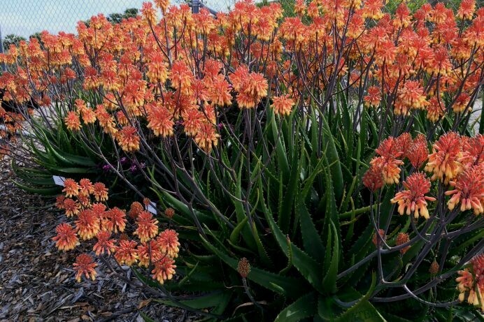 Aloe camperi, commonly known as Popcorn Aloe is a very rare Aloe, and one of the few that has verdant green leaves. The toothy edges are soft to the touch, and user friendly, on long, strap-like, slightly recurving leaves. Popcorn Aloe blooms later in the season than most Aloes, so it is a nice extension of the flowering season going more into the spring than other Aloes which tend to be winter bloomers. The flowers are unique also, as they tend to be less tubular, and a little bit more puffy in a beautiful, soft apricot color. Flower stems are slightly candelabra, and arise above the plants by about 1.5 ft. Excellent as a large, dramatic, container plant. Regular garden watering to very water-wise. Hardy to the high 20s. Not extremely heat resistant in full sun for interior deserts such as Palm Springs or Arizona, although fine with some shade.