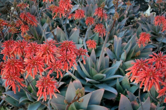 Its winter/early spring blossoms will startle you with brilliant orange flowers suspended 2ft above the plant on tall candelabra stems. Pups, or offshoots, form around the base of the mother plant, eventually producing nice clumps of up to 3 feet across. Full sun to part shade, very salt tolerant at ocean-side locations, does well from regular garden watering to very water-wise.