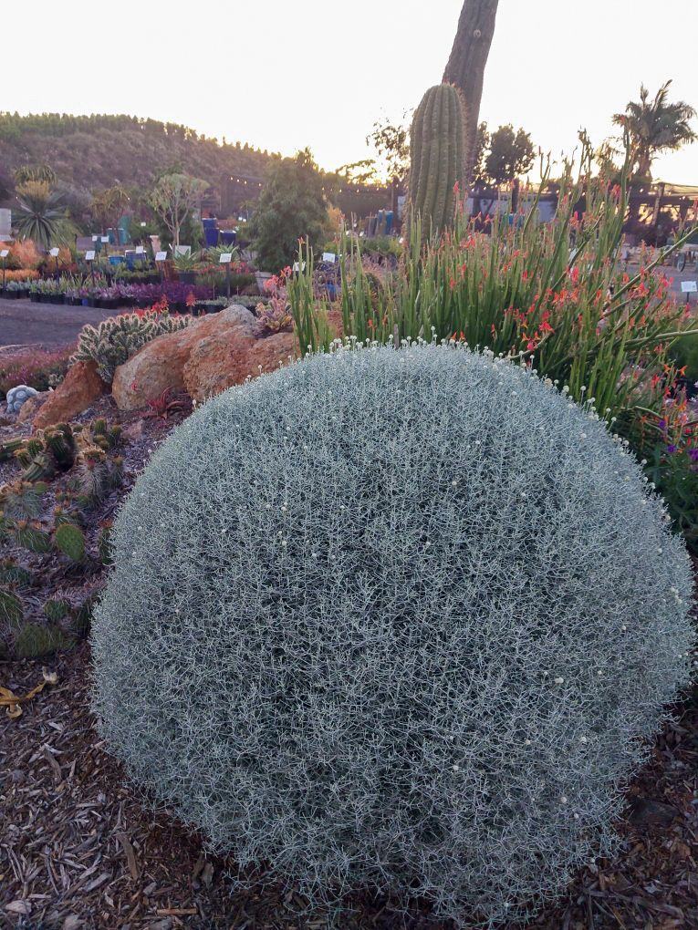 Intriguing plant that consists of silvery-white, wiry, leafless stems that grow in a dense ball up to 4’ all the way around. It can be lightly and regularly pruned to manage its size, and in fact we often enjoy keeping it very small as an interesting texture accent in potted plantings. The foliage is great in cut-flower arrangements, and can be dried and preserved. In the landscape, we like to use this plant in desert and rock gardens. In spring and early summer, it produces tiny little yellowish balls of flowers all over the plant. Definitely likes dry conditions, full sun, and will tolerate cold conditions down to the low 20’s. It’s fast growing and in fact, not a real permanent plant, so you might want to replace and start fresh every couple to every few years.