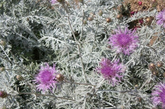 Centaurea gymnocarpa, known as Purple Bush Dusty Miller is a large, white-leafed, lacy shrub with beautiful purple, thistle-like flowers in spring and summer. Full sun, water-wise. A great white foliage accent among more common green foliage. Hardy to low 20° F. RARE!