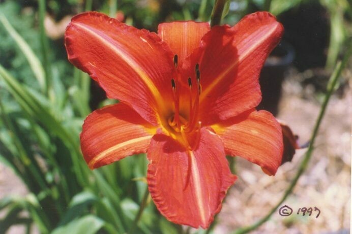 Hemerocallis Primo, commonly known as Daylily Primo, it has bright red flowers of broad, triangular petals, with a light center stripe on each petal. Flower size 6”. Foliage is a deep green, medium range to 24” with flowers stems to 3’. Best bloom seasons Spring/Fall. Likes full sun.