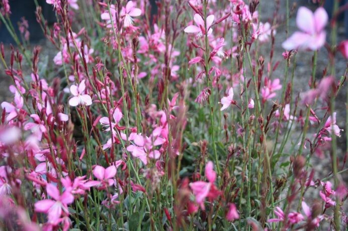 Gaura lindheimeri Pink Blush, commonly known as Pink Gaura is a perennial with soft burgundy tint to its foliage. Blooms pink butterfly-like flowers on 1ft slender stems most of the year, excluding winter. Full sun, good drainage. Nice wildflower look! Cut back 2 or 3 times a year to freshen foliage, and encourage re-bloom. Hardy to 0° F.