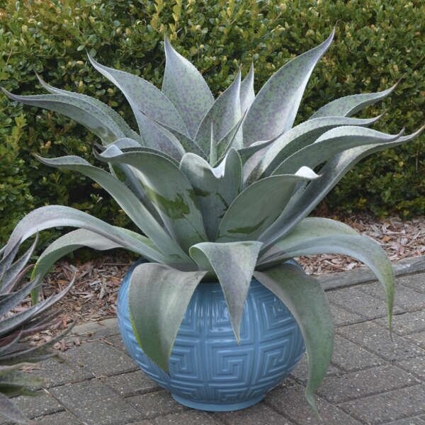 This certainly is a “king” of Mangave! Make sure you give this succulent plenty of room to grow so it can achieve its maximum potential. Wide, broad silvery green leaves are covered with burgundy flecks and form a very large rosette. A large terra cotta pot or a 3-gallon container will show off its impressive size the best.