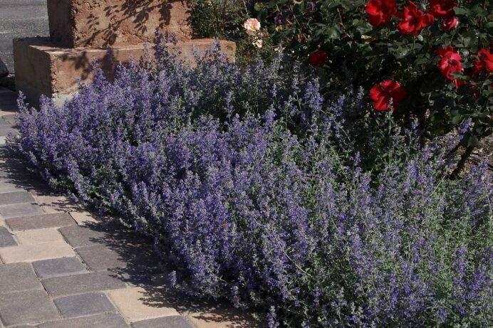 Fragrant perennial that grows in a low, spreading form to 6” tall by 2′-3′ wide. Great smelling, soft gray foliage is loaded with purple-blue flowers spring through fall. Loves hot sun. Water-wise. Hardy to 0° F.