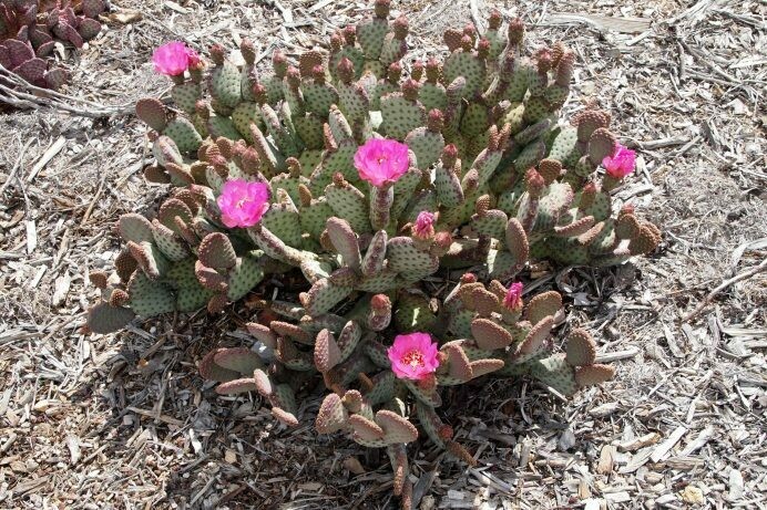 Opuntia basilaris ‘Caudata’, commonly known as Baby Beaver Tails, is a compact prickly pear cactus only grows to 18 inches tall and slowly to 2’ wide, and can be pruned occasionally. Springtime finds these beautiful silver-blue pads covered with brilliant, delicate, bright pink flowers.