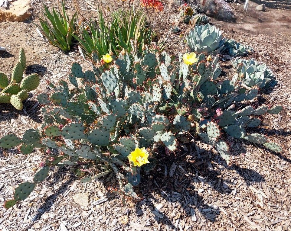Beautiful, small, turquoise pads back light the jet-black spines of this low-growing, extremely hardy and durable little “Prickly Pear.” If that weren’t enough- absolutely covered with brilliant yellow flowers, with a deep red center- so many that they completely cover the plant. Now most Opuntias bloom in the spring and then they’re done. Not this golden Baby! It will re-bloom, and then re-bloom again. We’ve seen some flowers going right into September! Never taller than about a foot, and to about 2’ wide; full sun, hardy to low teens.