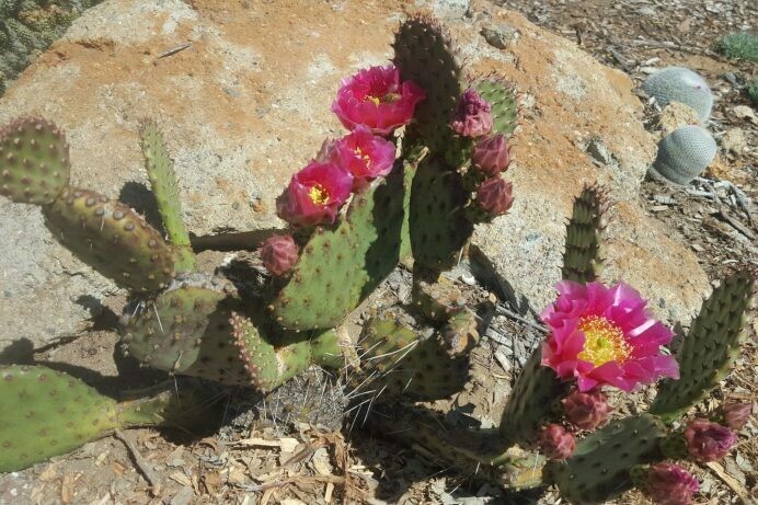 Opuntia ‘Mon Cherry’ is a vigorous spreading low shrub of violet-tinting pads (in winter), exploding with huge, wax-like flowers of brilliant shocking, hot pink in spring. Heavy bud set, with many multiples of buds on each pad. A complete show-stopper, a single mature plant can have hundreds of flowers at a time! Cold hardy to sub-zero; robust, non fussy cactus for your winter-hardy garden, low desert eye-candy, or even along the California coastal plain. Can be grown from mountains to lowlands. Needs LOTS of sun, good drainage, and some summer watering.