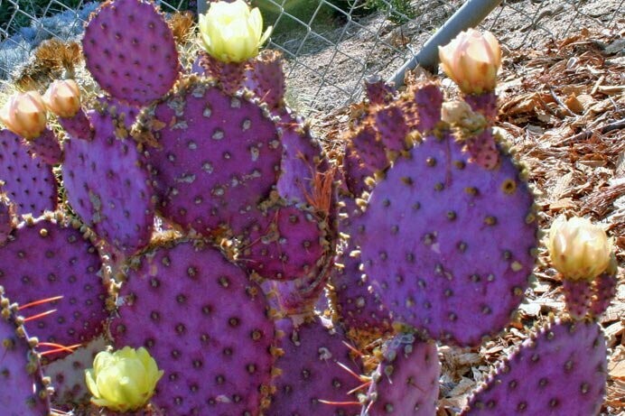 Opuntia Pinta Rita Prickly Pear is a very special cultivar of the ‘Santa Rita Prickly Pear’. The differences are as follows: intensified purple tinting of the turquoise under-color of the plant’s pads; much longer season flowering (from Spring through Fall); and new growth is bright red! Hardy to mid teens. Can grow to be about 3 feet tall and spread up to 6’ or more.