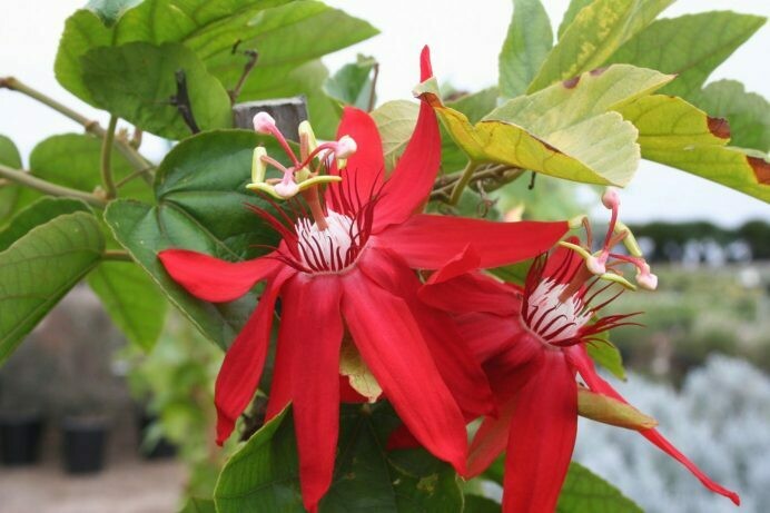 Passiflora vitifolia, commonly known as Passion Vine. Small to medium vine with rich, dark green leaves and exotic red or purple passion-flowers most of the year. Full sun to part shade.