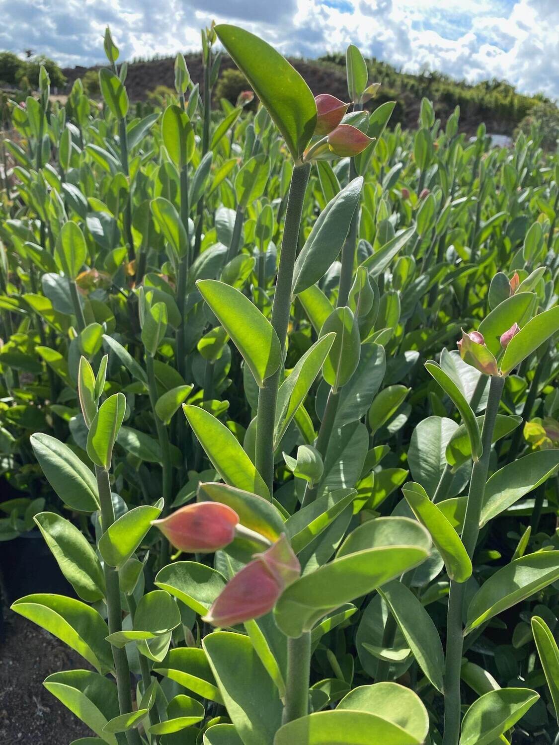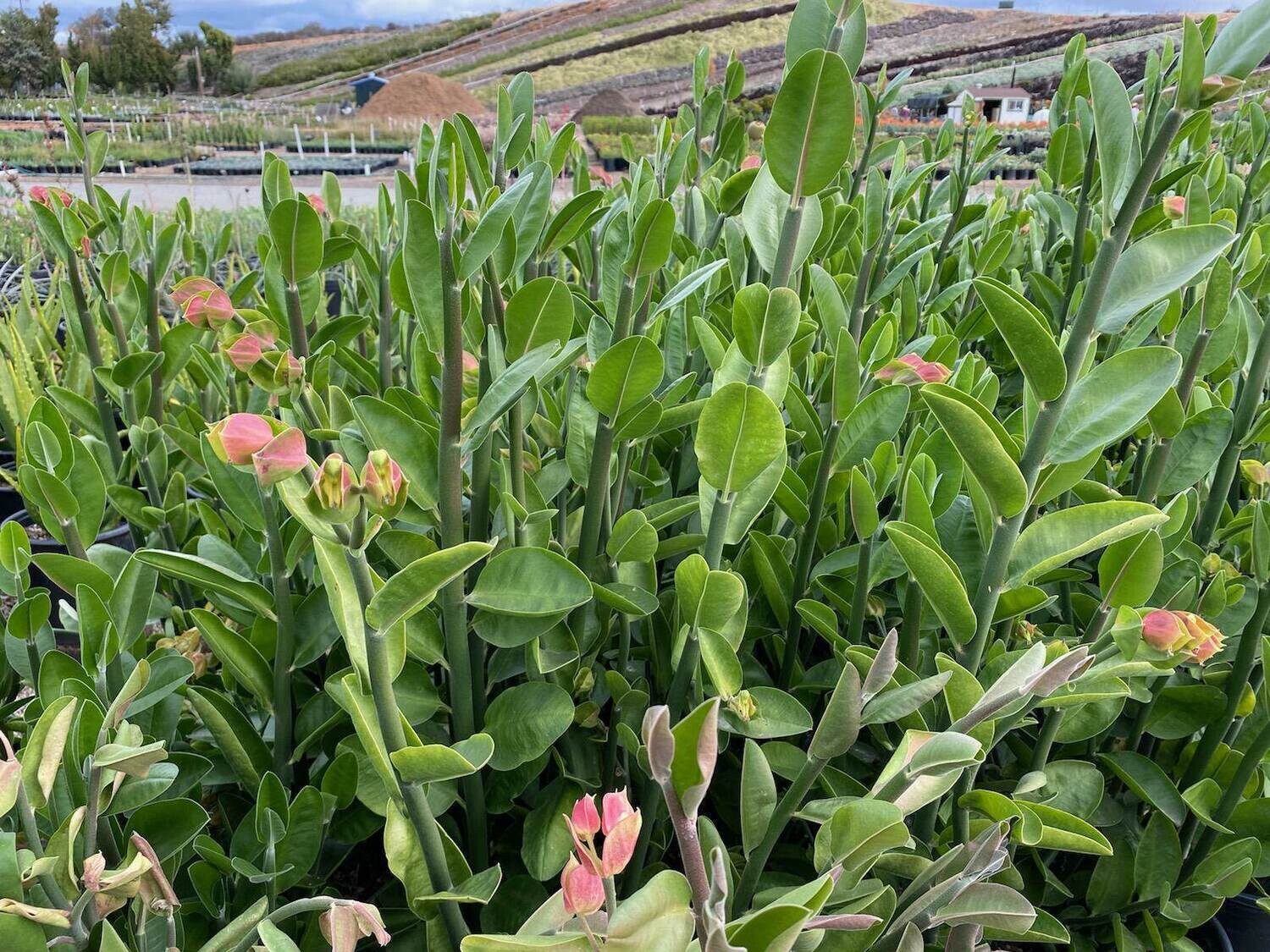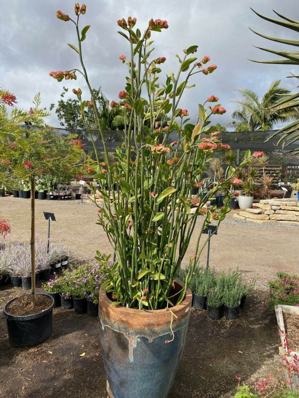 Pedilanthus bracteatus, commonly known as Tropic-Tillo, the equivalent of a thornless Ocotillo, growing with the same shape up to 8′ tall and tipped with coral flower brachts for a good portion of the year. Leaves appear with new growth, but drop off when mature or very dry, to expose elegant smooth green stems. Striking vertical accent! Water-wise, but tolerates regular garden watering as well. A member of the Euphorbia family, milky sap is irritating. Handle with care.