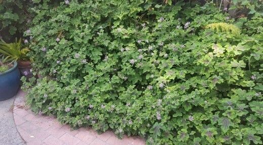 Velvety green leaves have a maroon pattern in the center. Grows rapidly, spreading up to 8’ or more, but not getting taller than about 2’. Excellent plant for all conditions- sun, shade, wet, dry. Extremely fire-resistant- even dried materials hardly burn. Amazing vegetation for large areas and slopes, providing a lush green coverage. No pests, herbaceous stems, rapid growth. Tender to frost and freeze, but will quickly grow back if damaged.