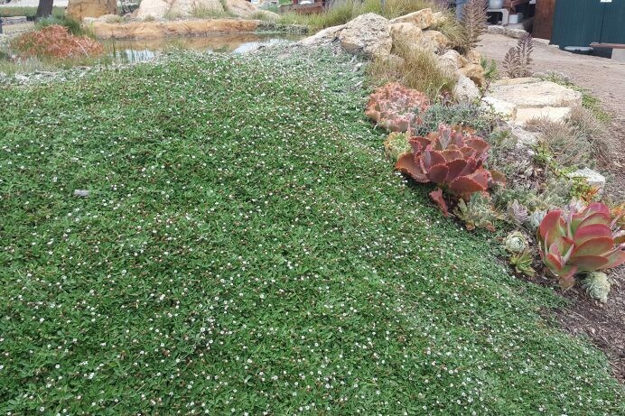 Phyla nodiflora, commonly known as the Frog Flower is an amazing, dense, low, spreading ground cover plant rarely exceeding 1” in height but capable of spreading 2-3’ wide. When planted 2-3’ apart, they quickly fill together to form a solid mat of bright green foliage, often used as a lawn substitute. Sparkling with small white or pink flowers most of the year round. Drought tolerant when established, full sun to substantial shade. Hardy to low 20’s.