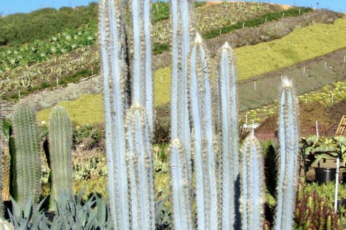 Pilosocereus pachycladus, commonly known as Bright Wooly Blue Spires. Semi-slender stems (to about 3 inches thick) are glow-in-the-dark light blue, probably one of the most unimaginable colors that you could expect of a plant! The stems are a nice vertical accent by shape alone, but when you kick in the color it’s like waving blue light wands in the garden!