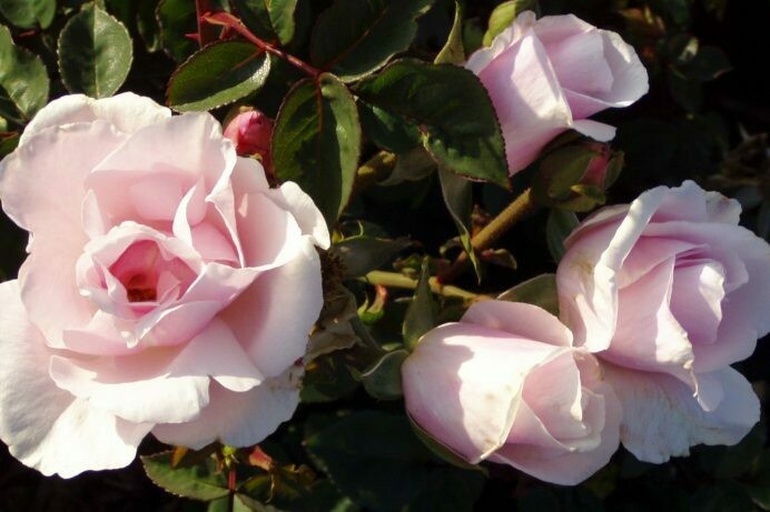 Rosa ‘Souvenir de St. Anne’s’ is technically classified as a Bourbon. This beautiful antique pastel pink floribunda has semi-double blooms, with a musky cinnamon/clove fragrance. Its blossoms fade to a lovely white after opening. Blooms repeatedly throughout the year and is quite tolerant of partial shade. Its foliage is deep green, disease and mildew resistant. In our experience, it grows to be a graceful, 2-2 1/2′ round. Not recommended for direct coastal areas. Use where you need the look of white ‘ICEBERG’, but on a compact plant.