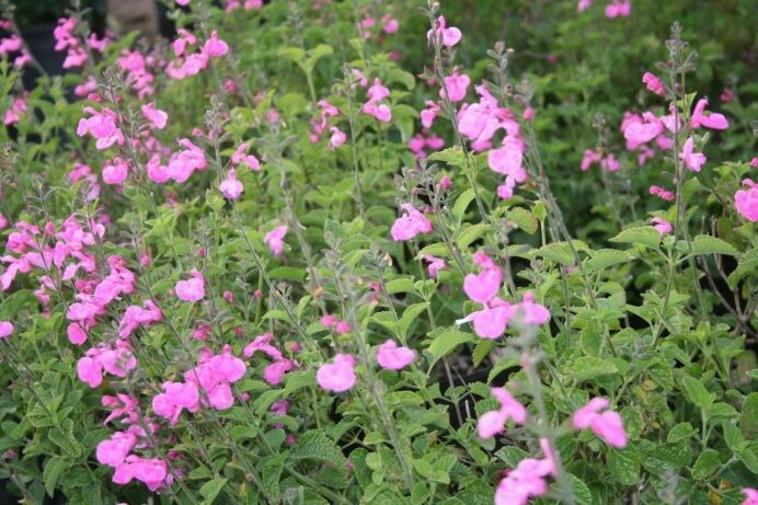 Salvia microphylla, commonly known as ‘Big Pink’Sweet, has sage scented, mint-like leaves of bright green laced with cheery, bright pink flowers will just make you happy all over! Sprinkle these into your garden for a punch of pink color. Bloom most of the year, they’ll keep you smiling even on dreary days. Not fussy about their soil, but do not like their feet wet. Approximately 2-3 feet tall by 3-5 feet wide. Hardy to 28 degrees. Drought tolerant when established.