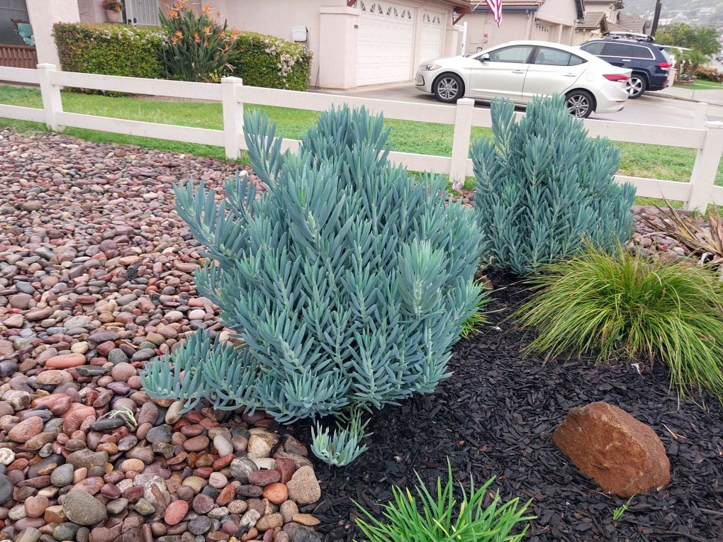 A robust, upright mass of lush “blue” foliage in columns up to 3’ and ultimately as wide. Great for large in-fill of slope areas, and for fire-safe screening. Beautiful as individual specimens as well. Unlike its near relatives, doesn’t seem to have the summer rot and damp-off syndrome that its “brothers” are known for. Full sun, or part shade. Hardy to high 20’s. Not a good low-desert candidate amid extreme summer temperatures.