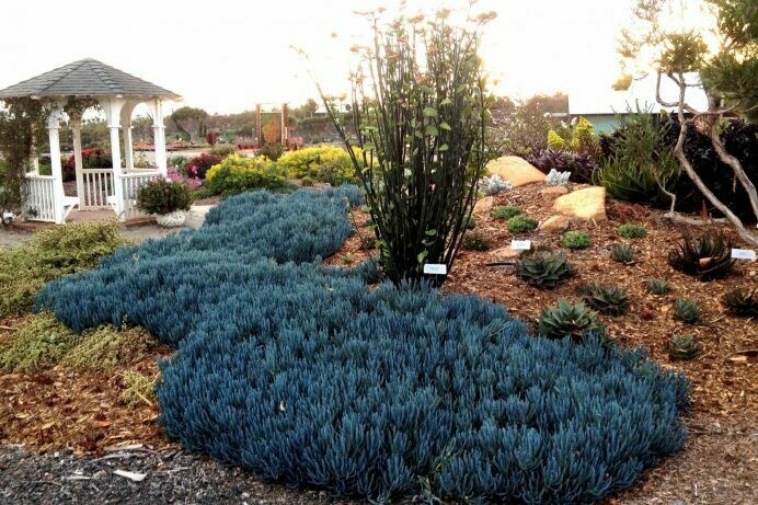 Senecio mandraliscae, commonly known as Blue Pickle, forms spreading carpet of waxy blue foliage. Perfect for slopes or a striking low foreground of contrast. Spreads quickly with no matting, thatch or build up. Full sun, waterwise. A great groundcover.