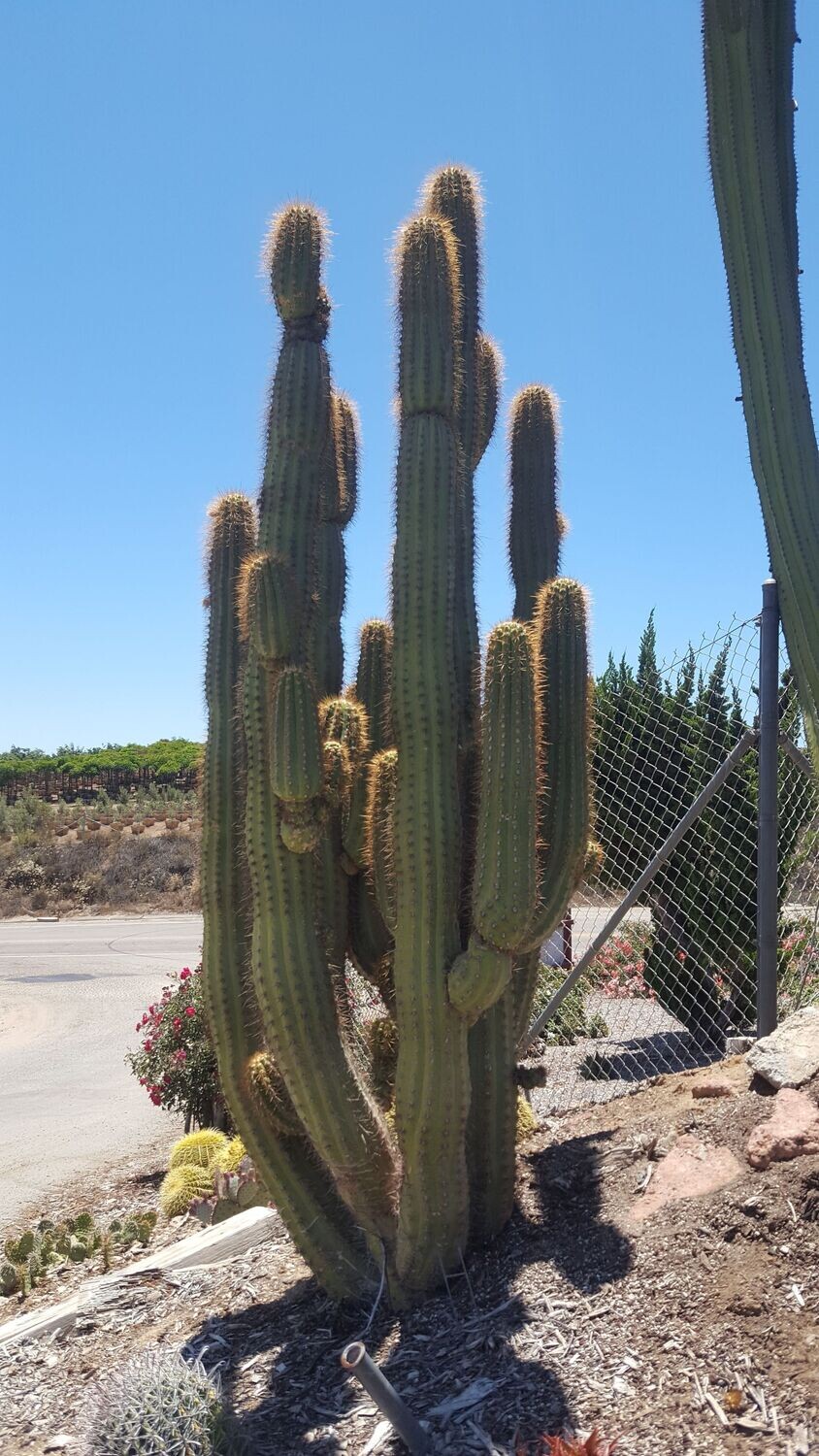 Beautiful golden spines that radiate in the sunshine, grace the “organ pipe” like columns of this very cold-hardy columnar cactus. To 10’ tall with multiple columns, bearing HUGE, fragrant, white flowers with golden sepals, in the spring and summer. Hardy to single digits, full sun- large plant.