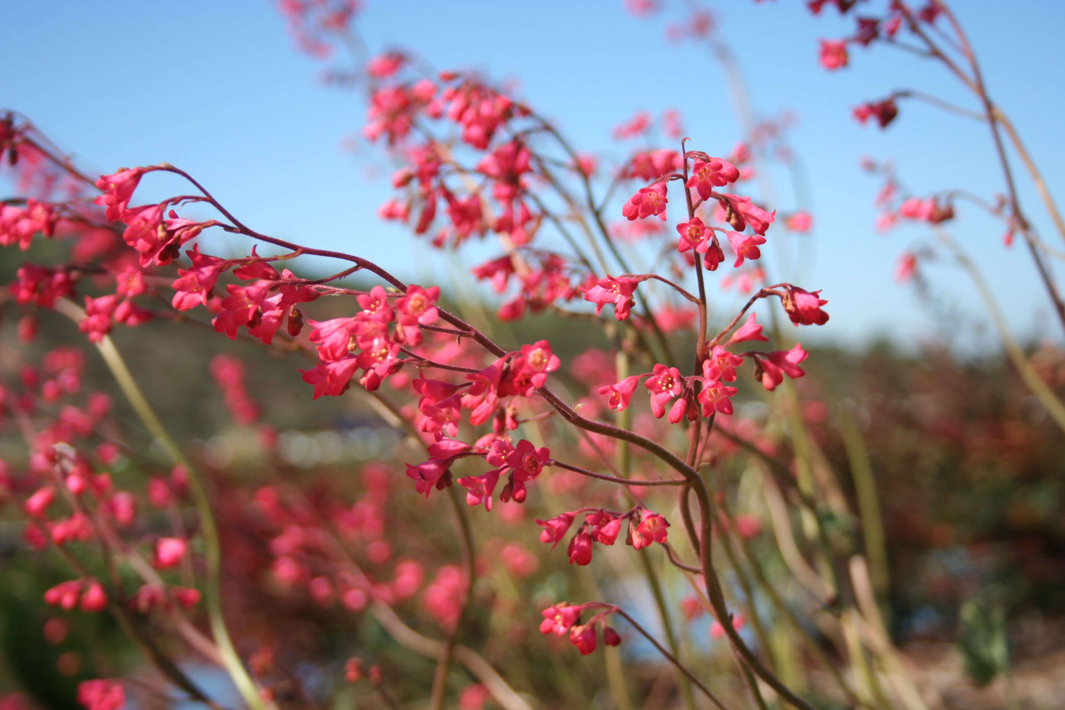 Heuchera sanguinea blooms winter through spring on slender stems about 18” tall lined with bell shaped coral flowers deriving from a cluster of low green rounded leaves at the base. These “Coral Bells” add graces and color as they dance in the breeze. They like filtered sun or partial shade to full sun along the coast, regular garden watering, and attract Butterflies and Hummingbirds!