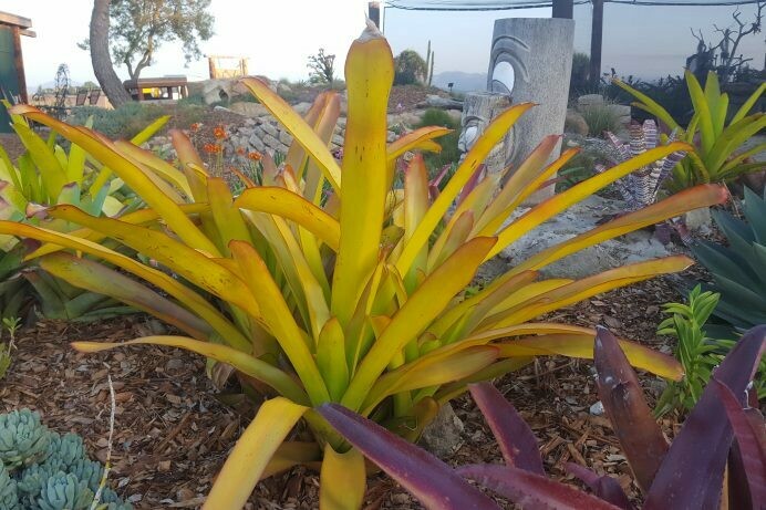 Aechmea blanchetiana, commonly known as ‘Apricot Sun’. Is one of the most popular landscaping bromeliads for a tropical looking garden. These giants can grow up to 4.5′ high and 3′ wide! They develop their glorious orange or “apricot” coloring in full sun. In the spring they develop huge brilliant red flower stalks that emerge from the tight center rosette of leaves. The aechmea blanchetiana is a very prolific plant which can produce as many as a 6 offsets from one plant.