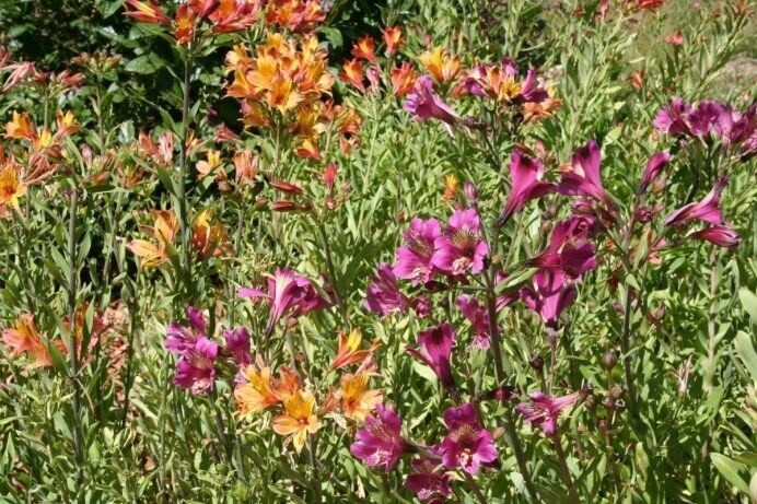 Alstroemeria sp., commonly known as Peruvian Lily, has blossom that resemble azaleas, usually in two-toned colors blooming winter through early summer. These evergreen hybrids love the sun, but also do well with light shade. Flowering season can be prolonged by pulling out spent stems. Free and graceful growth habit. Likes regular watering. Hardy to high teens. Dwarf or compact varieties grow in tight clumps less than a foot tall with the same colorful flowers. Needs partial shade in hot interior valleys. Plants will show various acts of dormancy during hot summer months, ranging from arrested growth to browning of foliage. Cut to the ground at this time to refresh foliage.