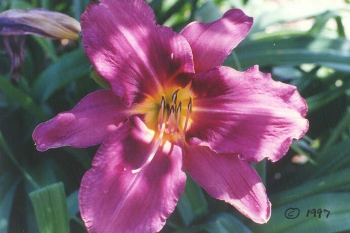 There is no purple in evergreen daylilies like the royal color of the Hemerocallis Russian Rhapsody! Clear, huge (6″-7″) flowers appear almost year-round with a very heavy bloom in the spring and fall. Bold-bodied, tetraploid hybrid grows lush, dark green foliage 18″-20″ in height with flower stems 22″-24″ above. The best purple in evergreen daylilies available.