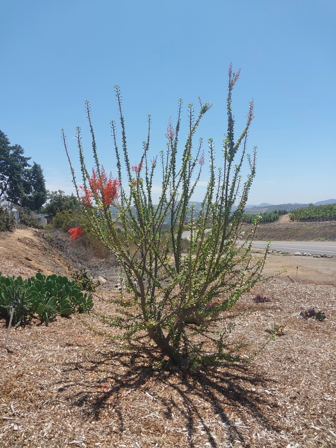 Waterwise Botanicals introduces our new hybrid Ocotillo! When along the coast and inland valleys of Southern CA, it’s actually not hot enough for many Ocotillos to grow. They barely put on an inch or two of growth each year. To the rescue! Our new hybrid Ocotillo comes from characteristics accustomed to a cooler climate already, so it thrives, has brilliant red flowers, and grows abundantly in coastal So. Cal, yet is also good in hot inland deserts also- from Las Vegas to Palm Springs and low desert Arizona. Typical Ocotillo growth, except a little bit bushier habit. Can be pruned for a more upright, traditional look. Hardy to teens. Full sun; up to 8’ tall and 4-6’ wide.