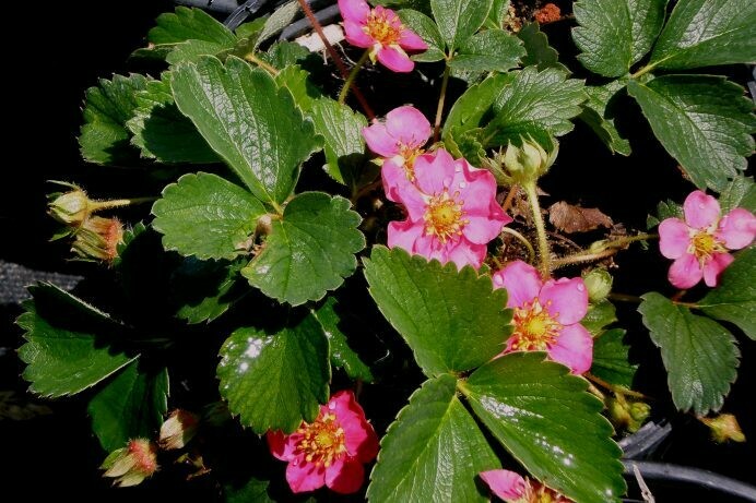 Fragaria Ornamental Strawberry has little, pink flowers on strawberry plant that blooms most of the year. Delicious, sweet, small to medium fruit. An ornamental with good taste! Regular water. Nice for borders or containers. Full sun.