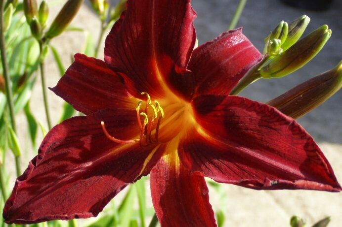 Hemerocallis Black Suave, commonly known as Daylily – Black Suave. Very unique in color! A deep, luxurious, almost black-red, with dark color extending down into the flower stem. If you can never get enough rich color in the garden, you’d better add this one to your collection. Wonderful contrasts color in the garden. Deep red doesn’t get any better than this! Foliage growth 20″-24″ with flower stems to 3′.