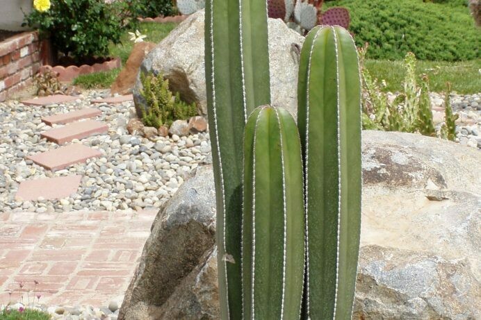 Lemaireocereus marginatus, commonly known as Mexican Fencepost Cactus has perfectly vertical, dark green columns with 5 to 6 ribs that are braided with an ivory colored margin that is almost thornless. Because of its vertical habit, it really is commonly used as fencing in central and South America where stems are planted so close together that they literally form a wall of cactus columns!