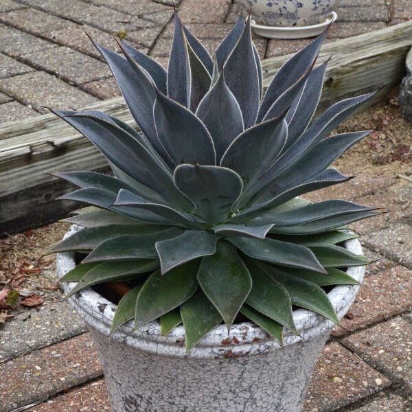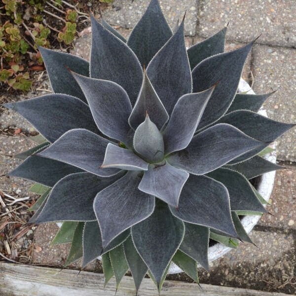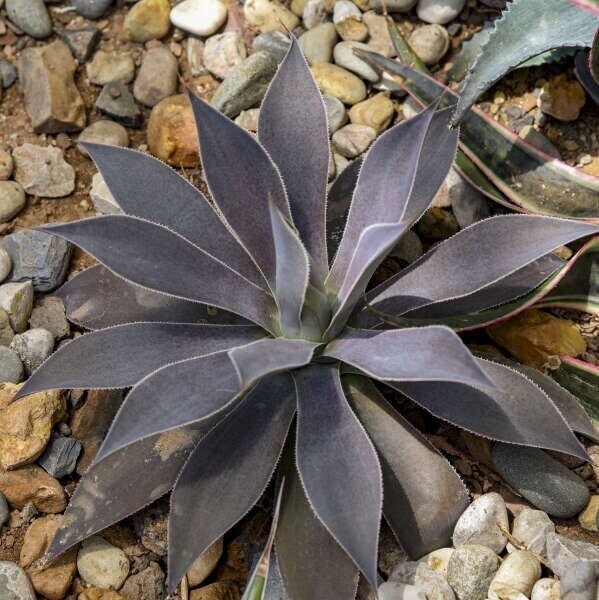 ‘Lavender Lady’ is a unique, feminine beauty whose solitary rosette habit and smoky purple coloration make it look very similar to an Echeveria. In direct sunlight, smoky purple leaves are formed at the top of the rosette and have subdued burgundy purple dots. As the rosette ages, the ovate leaves lighten to green, forming a two-tone effect. Each 1½” wide leaf has a cinnamon brown terminal spine. The margins are lined with tiny white spines; running your fingers along them feels like a comb, as they are fairly benign. Its broad leaves combine well with Mangave with narrower leaves, like ‘Man of Steel’.
