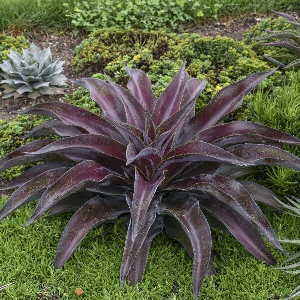 A common nickname for Mars is the Red Planet, and this Mangave gets its moniker due to the unique, intense red coloration from the leaves. 2¾” wide, thick green leaves are heavily speckled with burgundy red, with spots that bleed into each other for an overall red appearance. The red coloration is brought out best in direct UV light and becomes subdued under heavy plastic. The long leaves form an arching habit, caused by the tips of the leaves curving downward. Margins curl upward to show off its cinnamon spines, a nice color complement to the red.