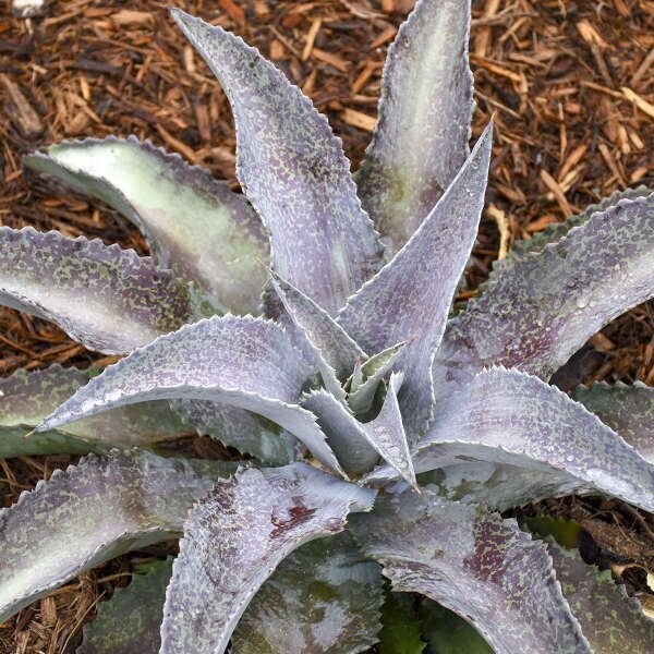 A stunning and exceptional variety in a color that you wouldn’t expect to see in a Mangave! Just like the white fur of a silver fox, this succulent glows nearly white when you first glance at it. In reality, it’s more of a light green covered with a thick waxy coating to give it that glowing color. Light blue-purple spotting appears underneath the coating, but is mostly unnoticeable from a distance. In addition to its wonderful color, ‘Silver Fox’ has a magnificent habit, with thick, arching leaves and defined marginal teeth.