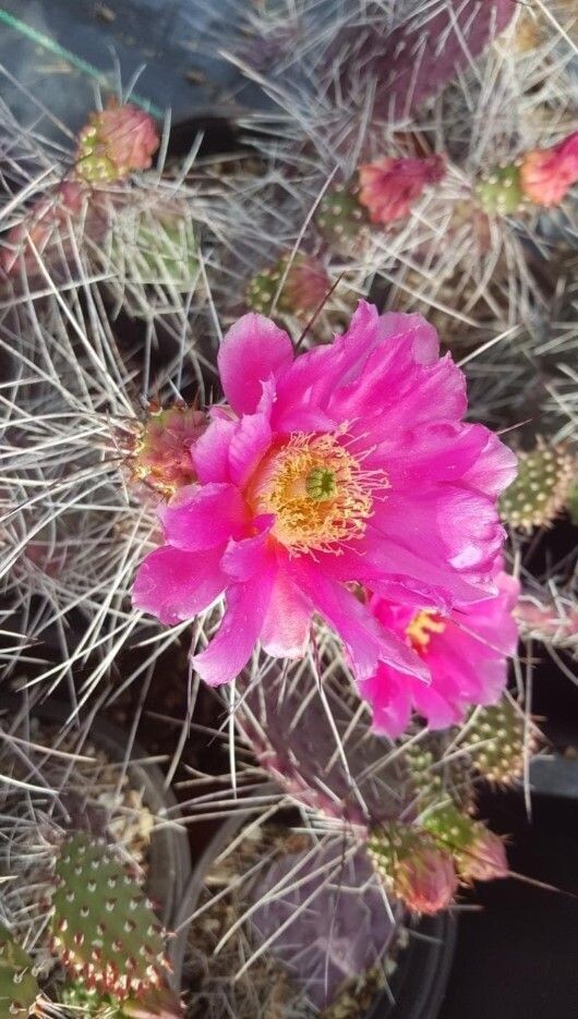 A cold-hardy favorite. Low growing, with small purple pads and black spines. Colorful all year round, and then splendid in spring when exploding in brilliant cherry pink flowers. Rarely more than 10” high, and slowly mounding up to a foot or two across. Hardy to 0 degrees, or colder, Full sun