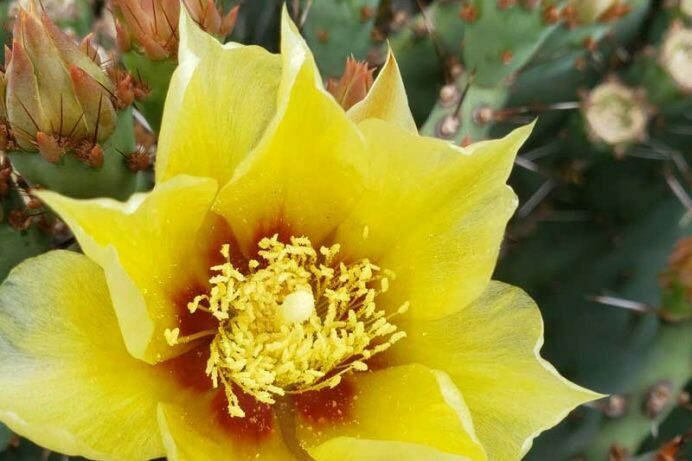 Beautiful, small, turquoise pads back light the jet-black spines of this low-growing, extremely hardy and durable little “Prickly Pear.” If that weren’t enough- absolutely covered with brilliant yellow flowers, with a deep red center- so many that they completely cover the plant. Now most Opuntias bloom in the spring and then they’re done. Not this golden Baby! It will re-bloom, and then re-bloom again. We’ve seen some flowers going right into September! Never taller than about a foot, and to about 2’ wide; full sun, hardy to low teens.