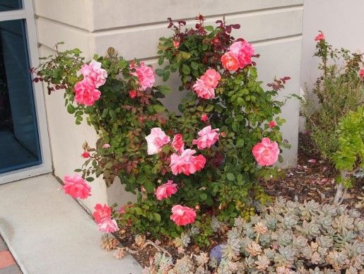 This rose is an exclusive variety, given to us by Ralph Moore (famous rosarian and hybridizer) some 25 years ago, to grow and standardize as a strong and very colorful landscape-rose variety. Brilliant, hot, safety-pink fluorescent flowers are born year round in coastal climates, and freeze to freeze in cold climates. Leaves are very colorful deep burgundy new growth, contrasting spectacularly with the color of the flowers. Completely disease-free, drought tolerant when established; usually are about 3’ in size all around. Full sun to light shade.