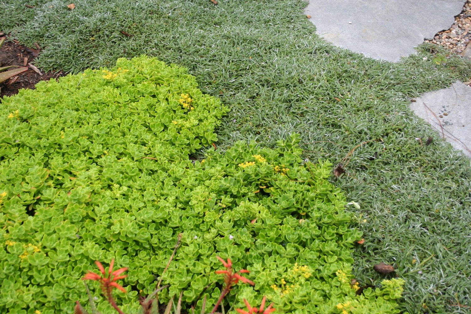 This sedum is cold hardy, and yet lush with the most verdant, light green coloration in its foliage that it almost glows out of nooks and crannies in the landscape, or found spilling over the edges of potted groupings, in contrast with other succulent colors. Adding to the green, are small yellow stars of flowers in small clusters, scattered among the tops of the leaves.