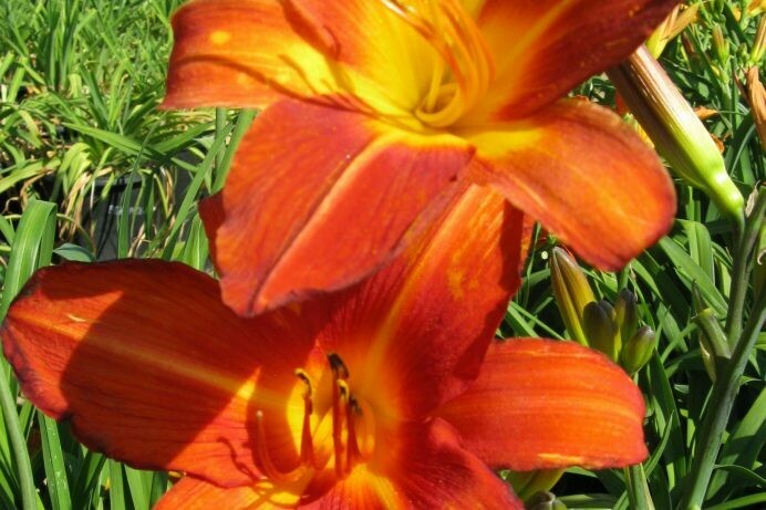 Hemerocallis hyb. Short Primo, commonly known as Short Primo is a rich, exuberant, hot red daylily with a cheerful orange center on rich green, straplike foliage. ‘Short Primo’ is almost identical to our variety ‘Primo’ only shorter! Great flowering performance on a semi-dwarf plant (20”) and flower stems not much taller, so a very good daylily for a line-of-sight visibility concerns where you might want hundreds of an incredible red daylily in a center median of a street, or for parking lot dividers. Flowers are star shape with triangular petals. Full sun, regular garden watering or deep waterings with 1 week dry-intervals, hardy to sub-0 temperatures. Avoit hot, summer desert sun.